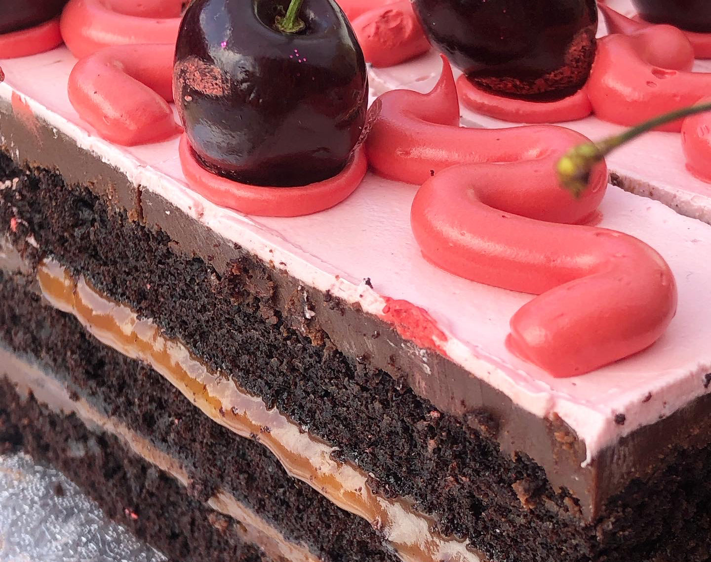 🧁 Chocolate fudge cake with dark chocolate ganache and caramel layers.